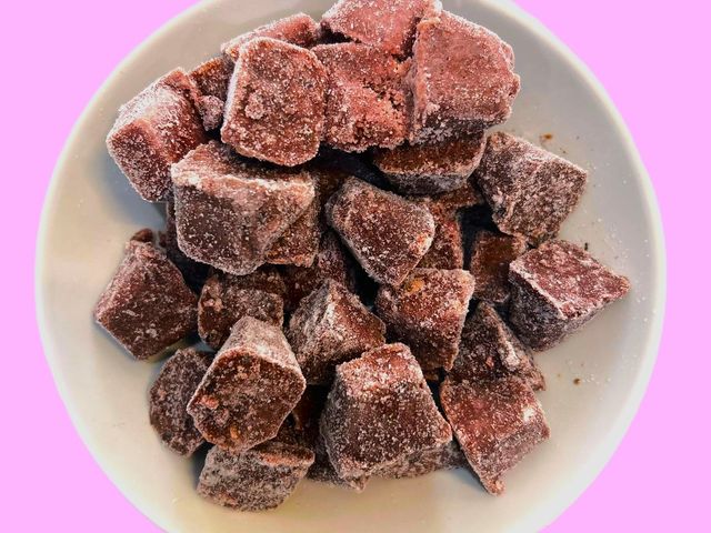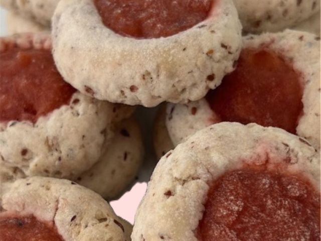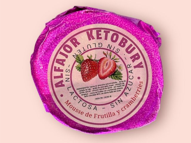 ALFAJOR RELLENO DE MOUSSE DE FRUTILLAS Y CRAMBERRIES DE HADA DEL CACAO. SIN LACTOSA, SIN AZÚCAR Y SIN GLUTEN