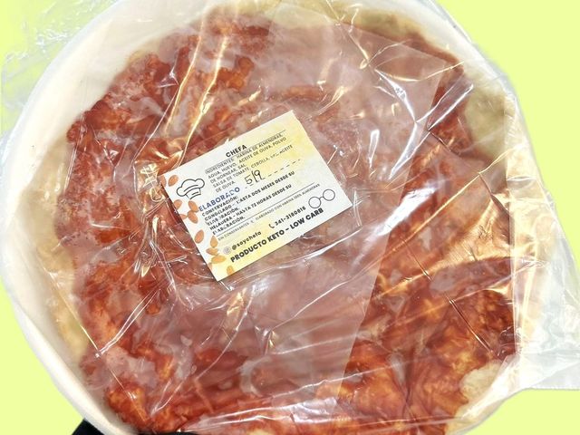 INGREDIENTES; HARINA DE ALMENDRAS, AGUA,HUEVO,ACEITE DE OLIVA, POLVO DE HORNEAR, SAL, SALSA DE TOMATE, CEBOLLA.