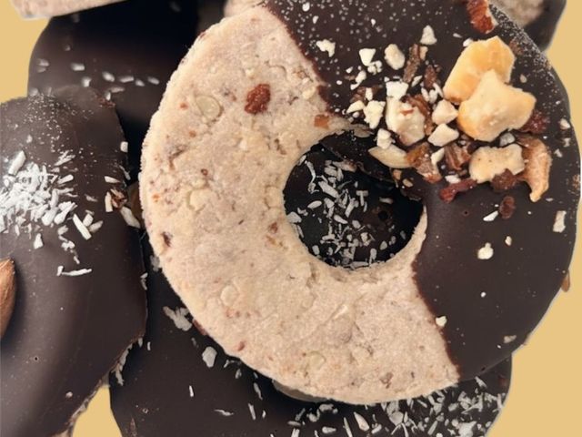 INGREDIENTES: HARINA DE ALMENDRAS Y HARINA DE NUEZ, ACEITE DE COCO NEUTRO, VAINILLA NATURAL, LECHE DE ALMENDRAS, LECHE DE NUEZ PECAN, STEVIA NATURAL,CHOCOLATE AL 90%, CACAO AMERGO, SAL ROSADA.