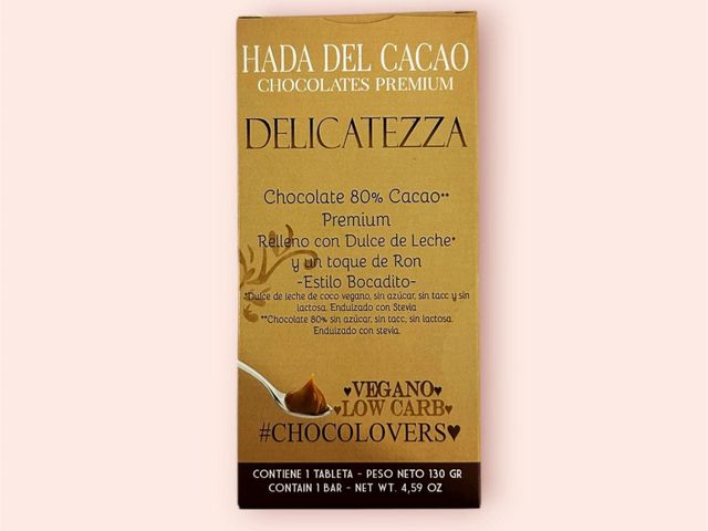 TABLETA DE CACAO AL 80% CON RELLENO DE DULCE DE LECHE DE COCO VEGANO CON RON. ENDULZADO CON STEVIA